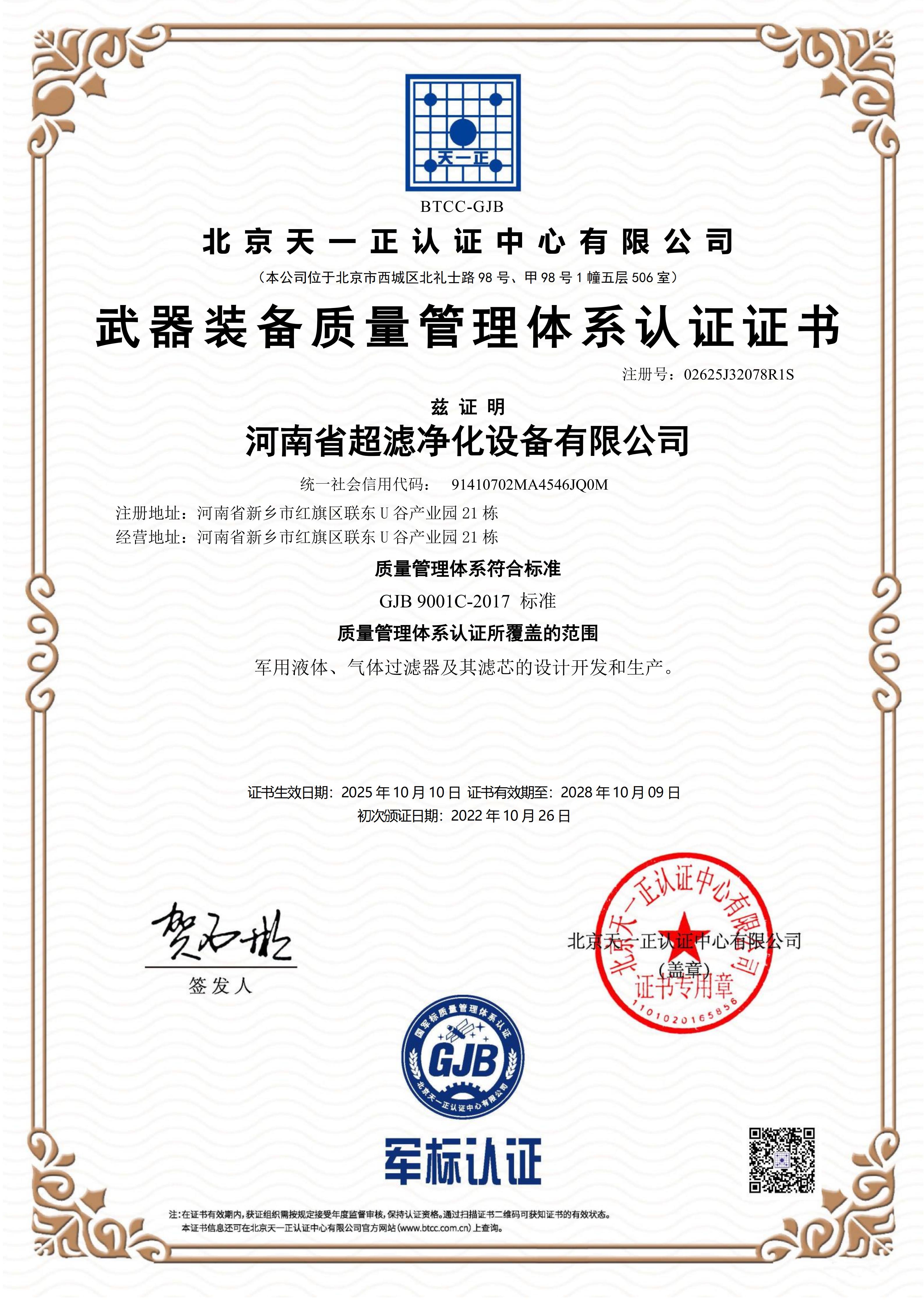 公司是過濾與分離行業(yè)協(xié)會(huì)會(huì)員單位,秉承“以質(zhì)量求生存,靠創(chuàng)新謀發(fā)展”的指導(dǎo)思想,始終把產(chǎn)品質(zhì)量放在前位,不斷進(jìn)取,持續(xù)改進(jìn),精益求精,按照ISO9001標(biāo)準(zhǔn)建立了一套完善的質(zhì)量保證管理體系,2022年通過了國 軍標(biāo)《GJB9001C-2017》質(zhì)量體系認(rèn)證,使公司的產(chǎn)品質(zhì)量得到提升,也將規(guī)范公司的管理,為客戶提供更多的、穩(wěn)定的高品質(zhì)產(chǎn)品。